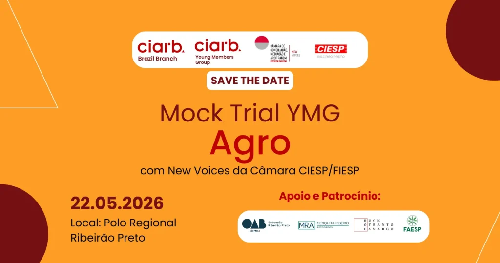 No dia 22 de maio de 2026, o Ciarb Brazil Branch YMG, em parceria com o CIESP-FIESP New Voices, realiza o Mock Trial YMG Agro em Ribeirão Preto.